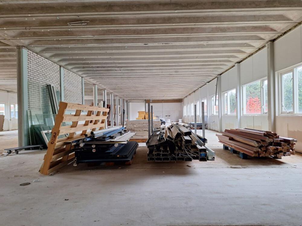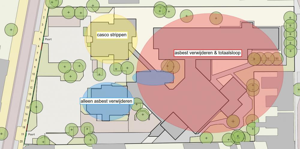 Wij zijn gestart met het demonteren van herbruikbare bouwmaterialen uit alle gebouwen en hebben die afgevoerd naar onze circulaire hub. Vervolgens hebben we diverse asbesthoudende toepassingen verwijderd en zijn we begonnen met het casco strippen. Nadat alle asbesthoudende toepassingen waren verwijderd en de gebouwen waren gestript, zijn we begonnen met de totaalsloop van het gebouw op het achterterrein.